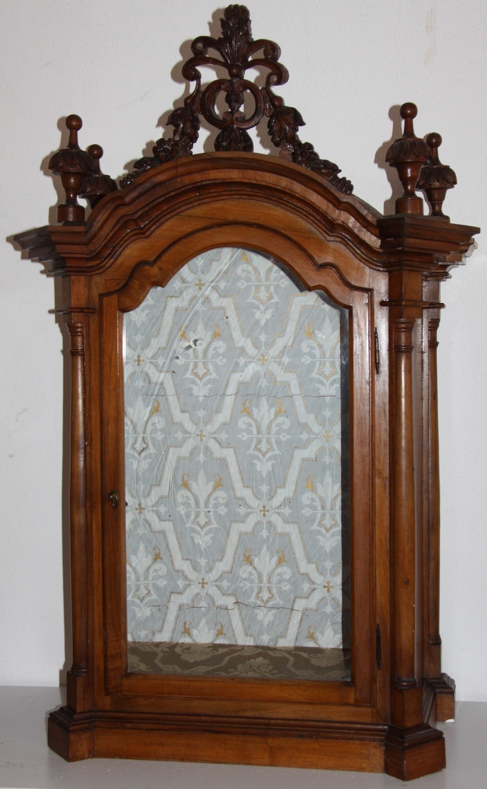 Mas, além do brilho e das celebrações, a Igreja Católica convoca os seus fiéis à oração. E por isso elegemos como peça do mês, um oratório que outrora adornava uma casa particular. Nele se guardava um crucifixo e dezasseis registos de santos (atualmente integrados no acervo municipal de Porto de Mós). Mais do que um móvel, o oratório era um elemento decorativo de harmonia e beleza, símbolo de fé, protegendo as imagens de poeira e quedas, espaço de devoção pessoal, junto ao qual se realizavam as orações familiares.